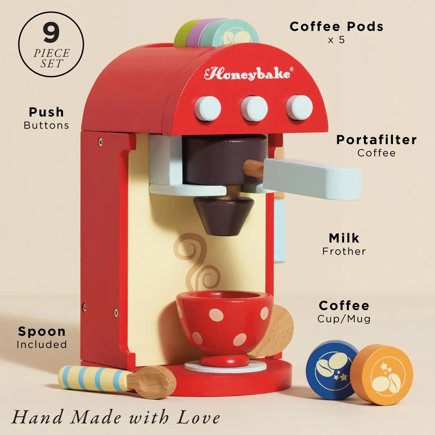 With a host of fun features to explore, including wooden 'coffee' pods that can be inserted into the removable portafilter, a 'milk frother', a pretty painted cupsand a spoon for stirring. The pods can be neatly stored away on the top of the machine when not in use.
