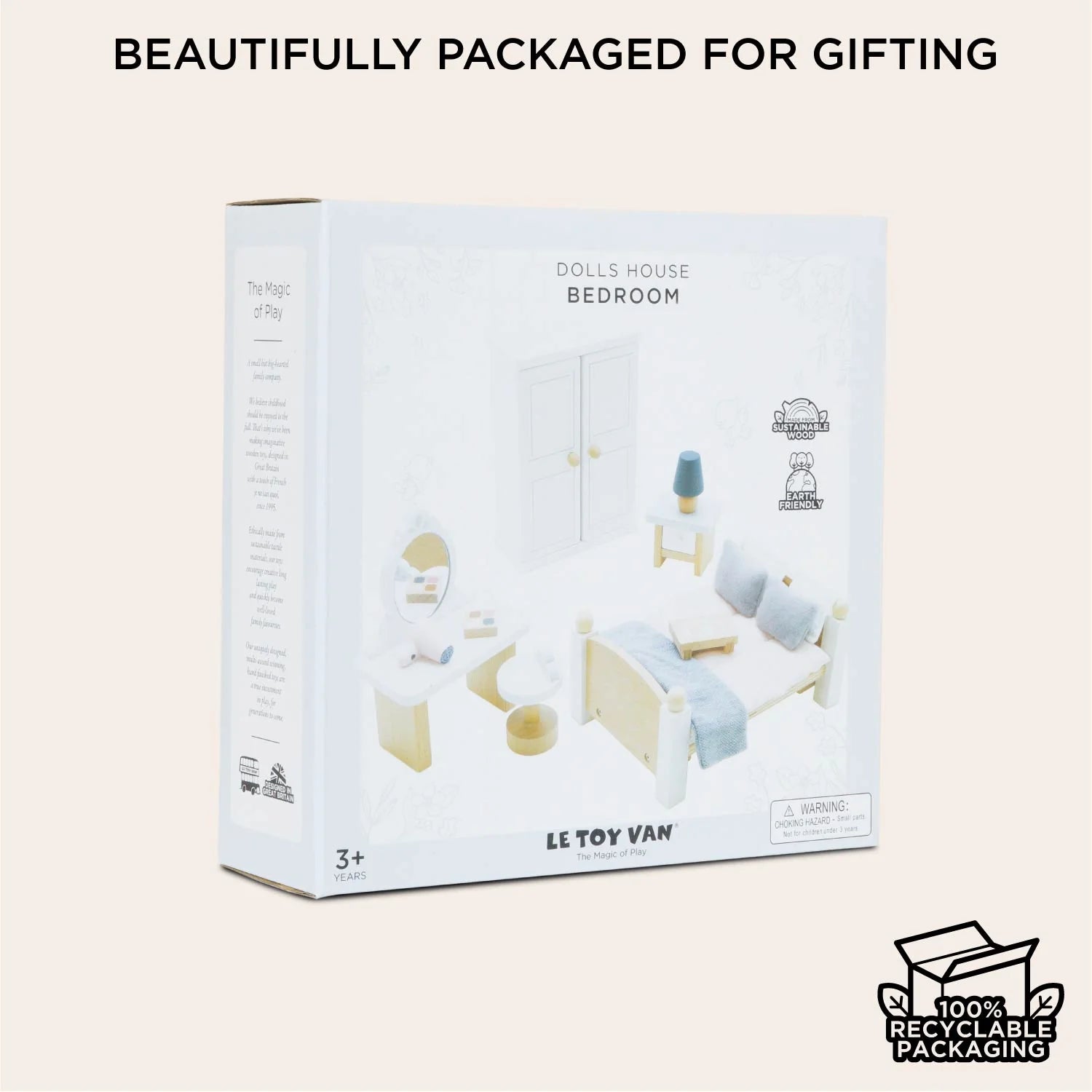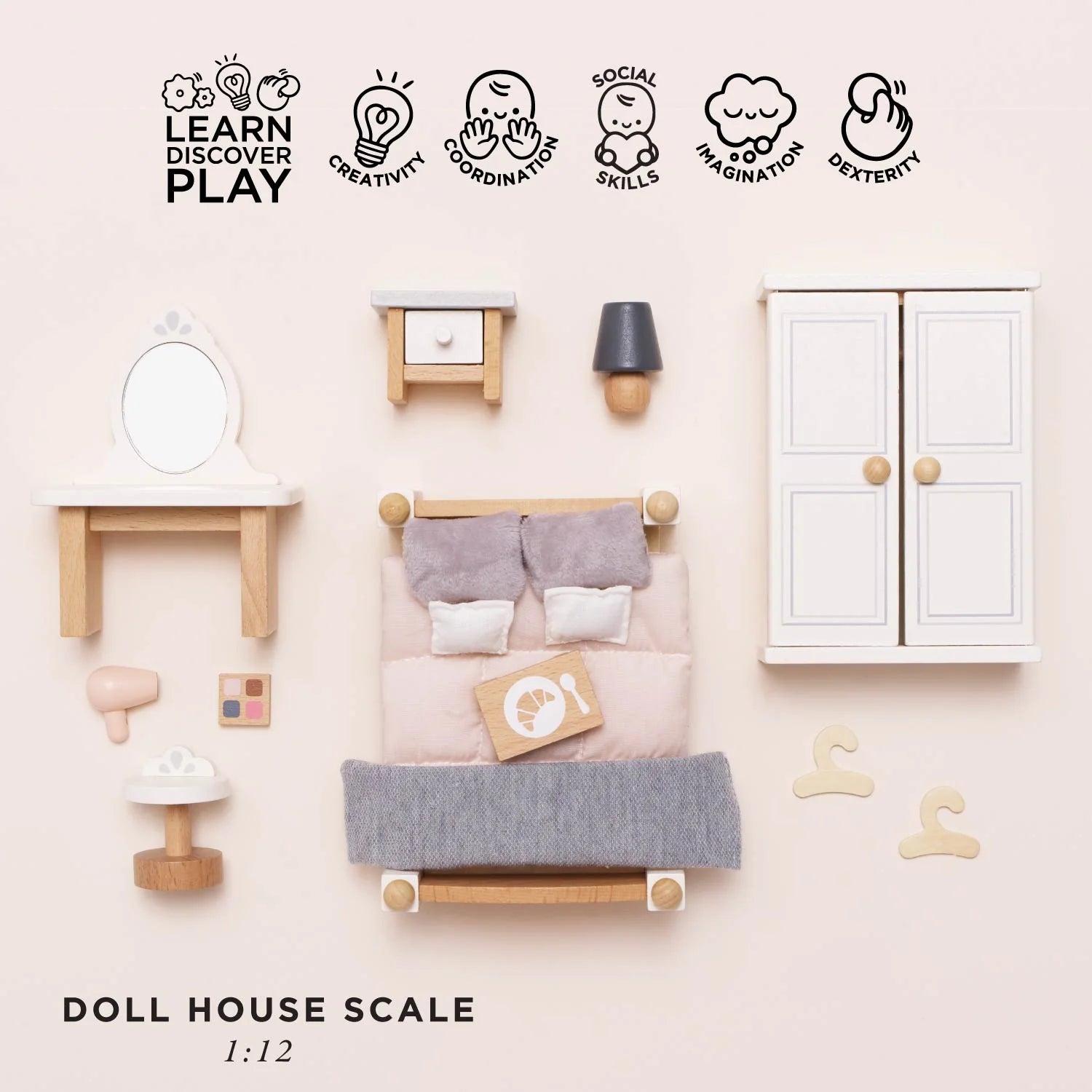 This sweet miniature bedroom accessory set is a real dream come true. With a classic design in lovely neutral tones, it is compatible with all of our beautiful wooden dolls houses and makes a stunning addition to any child’s small world play universe.