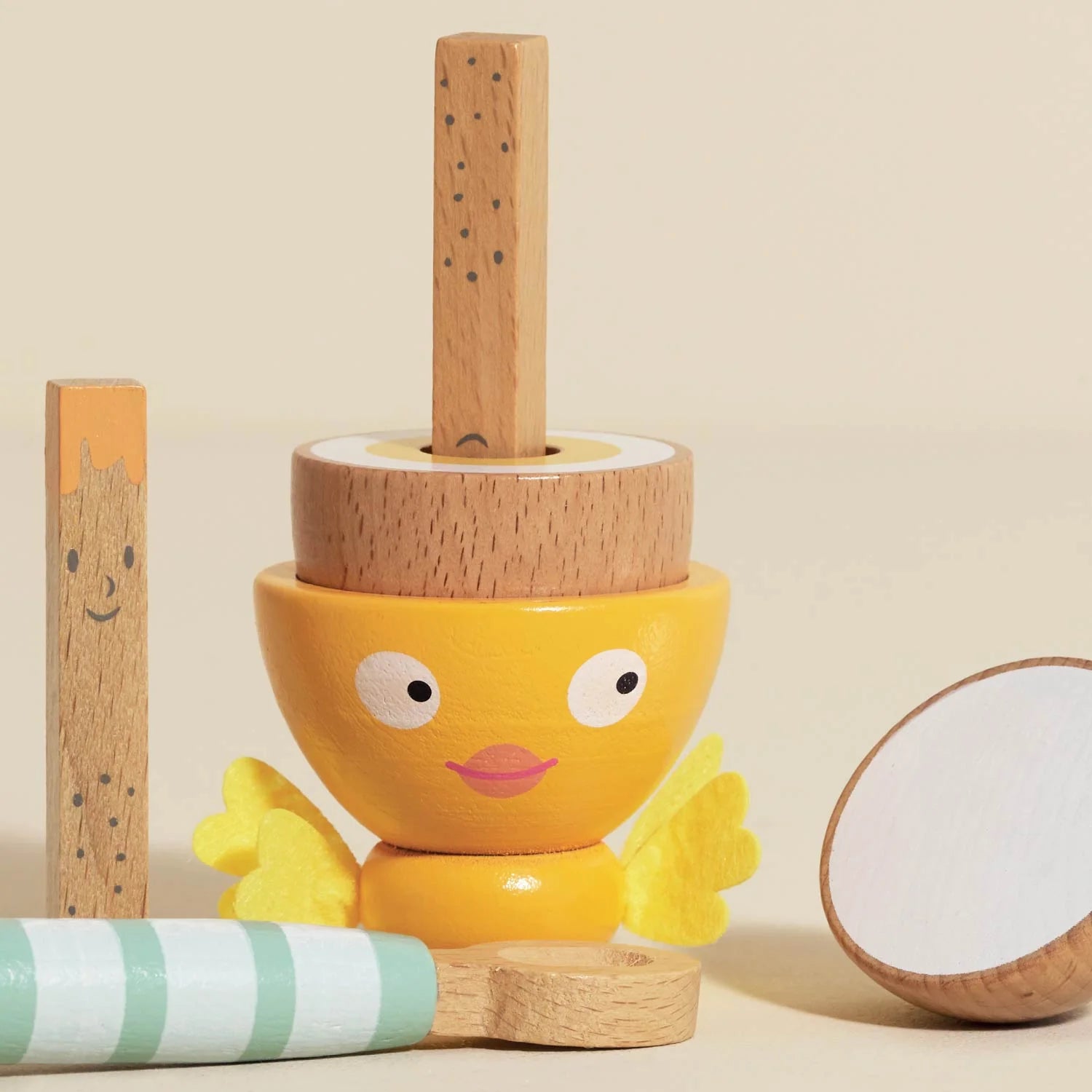 Breakfast is served! This sweet 6 piece wooden egg cup set is sustainably made by skilled craftspeople using solid wood and finished in non toxic water-based colours -for safe play, day after day.