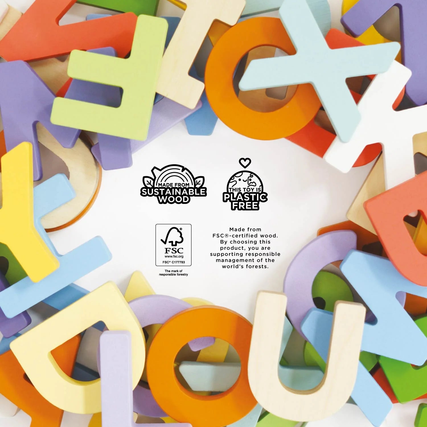 Spell your way to success with this lovely letters set for little wordsmiths. Crafted from sustainable, FSC® - certified wood, this 60 piece set is painted in sweet rainbow shades using child safe, water based stain. Learn the alphabet and form simple words with this delightful, plastic free toy, perfect for pre-schoolers and beyond. Complete with a cotton handled storage bag for stowing away safely at the end of a busy play session.