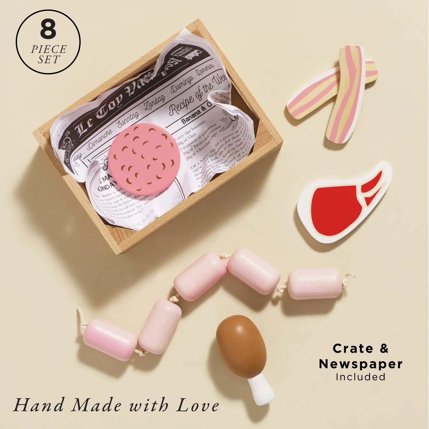This Market Meat Crate is jam packed with delicious goods including a sausage, steak, chicken, salami & bacon pieces - all made from solid, FSC®- certified wood and painted using child safe, non-toxic, water-based paints. These tasty treats come in a solid wooden storage crate, with a newspaper style insert, for realistic play.