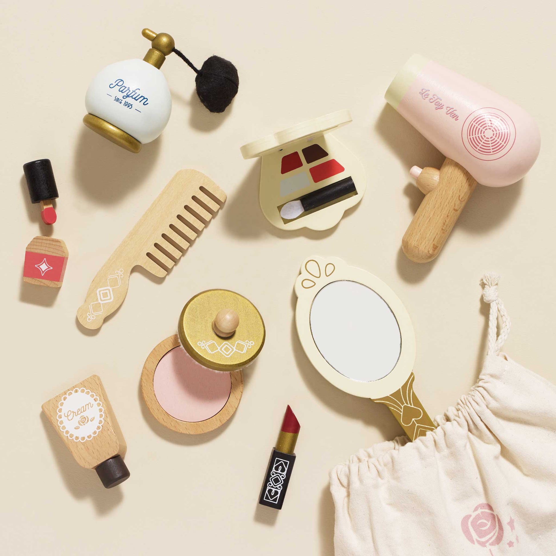 Budding beauticians can explore their creativity with this delightful fabric cosmetics bag made from natural cotton, filled with chunky wooden accessories. Hand-painted with non-toxic paints, the set includes: