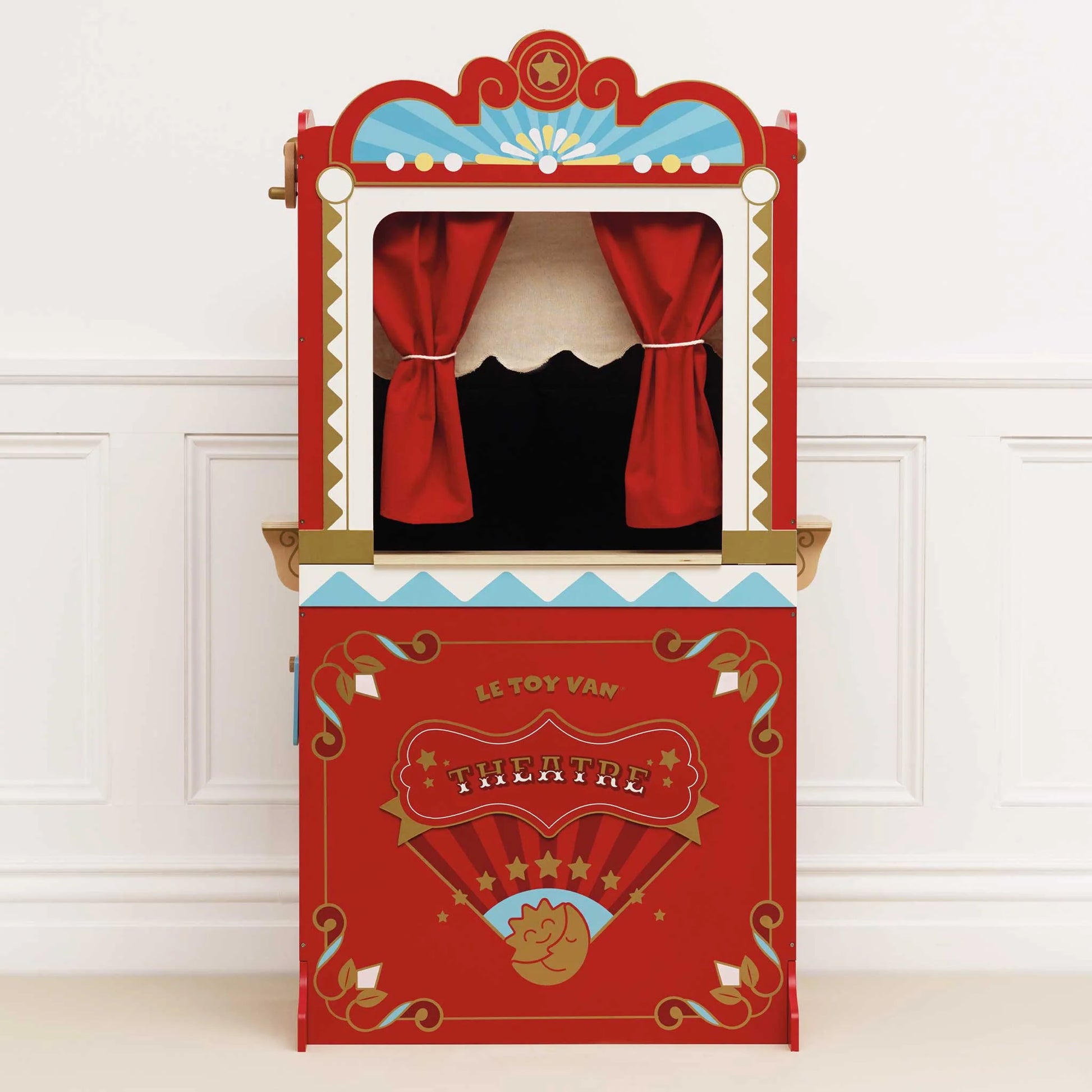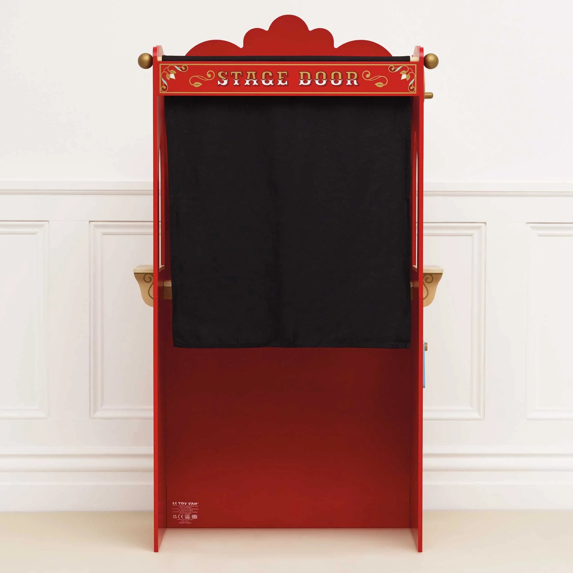 Step into a world of imagination with this stunning Puppet Theatre. Crafted from durable, sustainable wood, it features a colourful, retro design with a reversible sign, stage door, chalkboards, and dramatic red stage drapes. With three scenario windows (performance, snacks, and tickets), little performers can create endless shows and roleplay adventures.