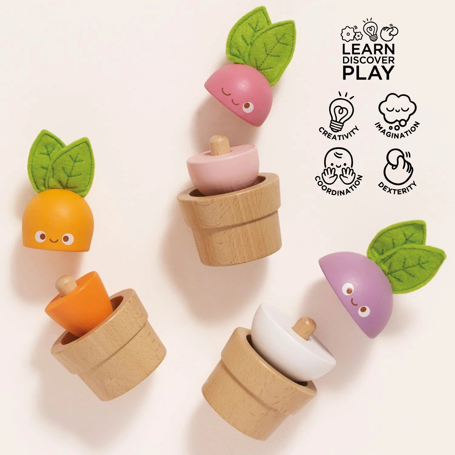 Mix and match to create a carrot, beetroot and radish all housed in their own wooden plant pots. This sweet educational toy is perfectly sized for little hands and developing imaginations.