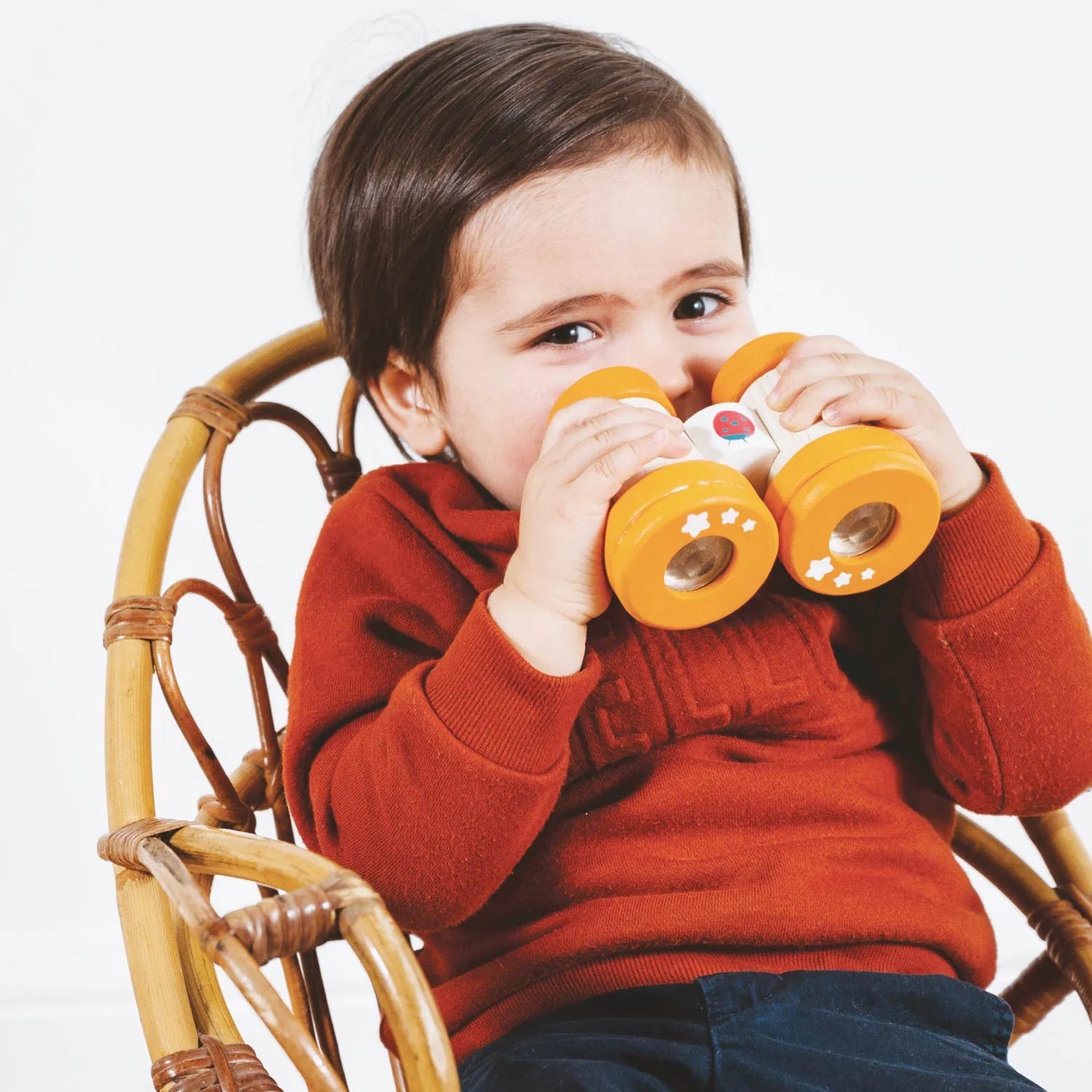 Made from solid natural wood, these children’s pretend play binoculars feature two spinning kaleidoscopic lenses for multi sensory learning based fun.
