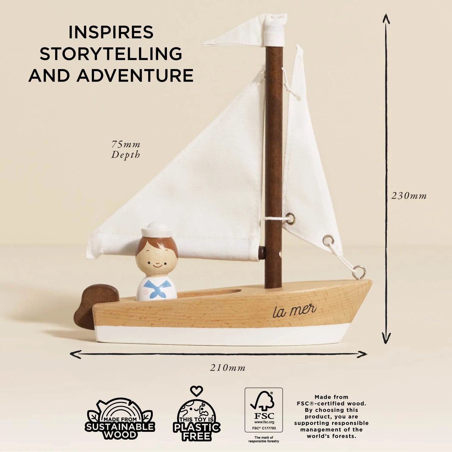 Our FSC® certified wooden sailing boat is a nautical gem, handcrafted to perfection. Full of timeless charm, it is crafted from beechwood with Walnut stained parts. The additional cotton flag and sails gracefully billow with the wind and propel the boat to boundless horizons adding to the imaginative play value of this toy.